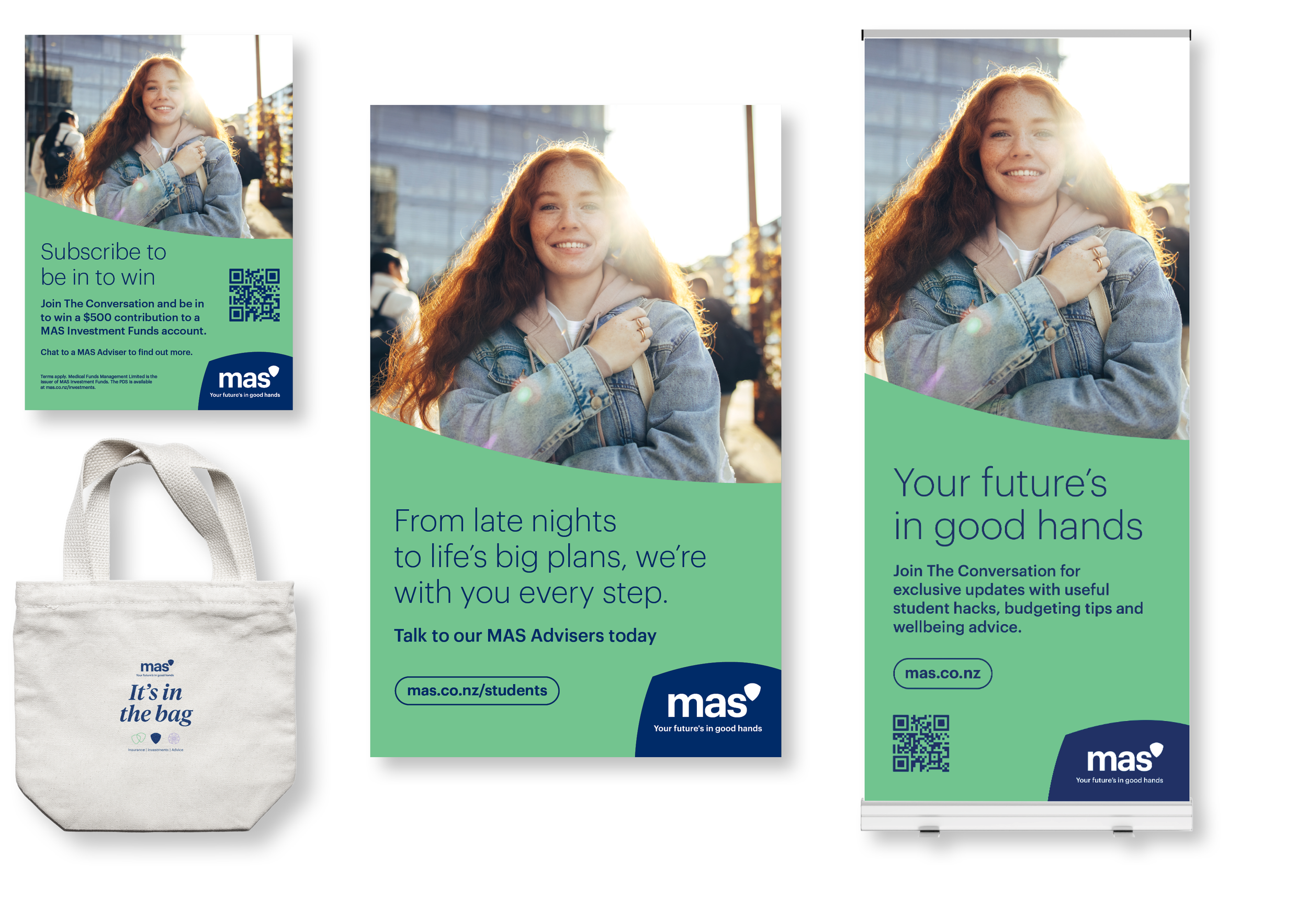 I designed a suite of promotional materials for MAS NZ Orientation Week, including a tote bag, strut card, stand visual, and pull-up banner. Each piece was created to work cohesively as part of a unified visual system, ensuring strong brand presence across the event space. The designs focused on clear messaging and bold, approachable graphics to engage new members and create a welcoming first impression. Together, the collateral helped establish a consistent and professional atmosphere throughout the orientation event.